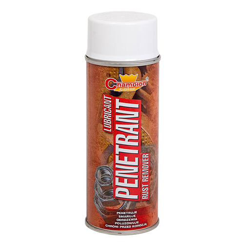 CHAMPION PENETRANT anticoroziv 400ml - un agent anticoroziv extrem de eficient care penetrează și lubrifiază în același timp. Conține disulfură de molibden MoS2, care, datorită structurii sale fizice și chimice unice, asigură o lubrifiere deosebit de durabilă și reduce uzura pieselor care interacționează. Se utilizează pentru întreținerea sistemului de frânare, slăbirea șuruburilor și lubrifierea tuturor tipurilor de lanțuri. Dizolvă rugina cu o viteză foarte bună și ajunge până în cele mai mici adâncituri.