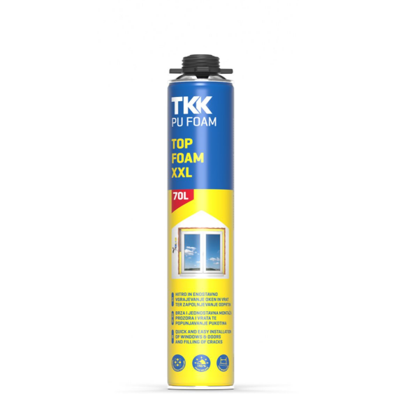 TKK TOP FOAM XXL 70L este o spumă poliuretanică monocomponentă pentru aplicare profesională cu pistolul. Este destinată montajului rapid al ferestrelor și ușilor, precum și umplerii golurilor și deschiderilor largi din construcții. Datorită randamentului mărit de până la 70 litri, permite realizarea unui volum mai mare de lucrări cu un singur tub.