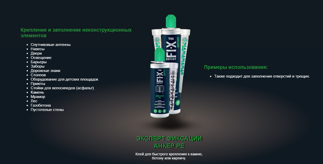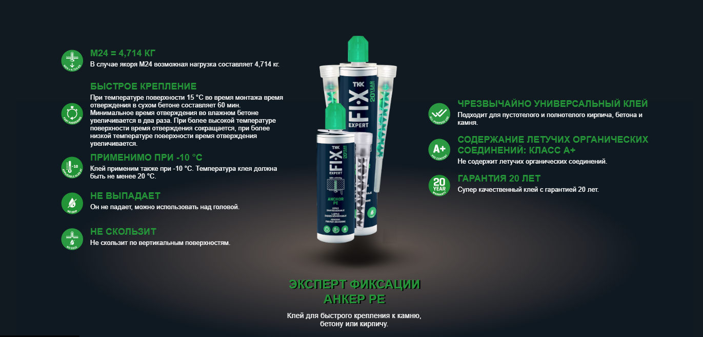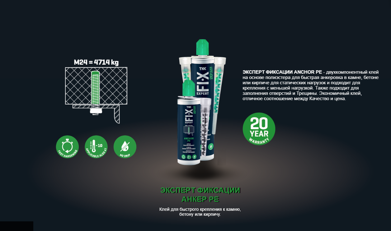 Adeziv Fix Expert ANCHOR PE 300 ml - adeziv bicomponent pe bază de poliester certificat ETA (agrement tehnic european) pentru fixarea în piatră, beton sau cărămidă. Proprietăți: uscare rapidă; pentru utilizare în beton umed și uscat; instalare rapidă; utilizare în interior/exterior; rezistență la temperaturi cuprinse între -40 °C și 80 °C; еxtrudare și injecție ușoară; putere adezivă ridicată, astfel încât rezistă la sarcini mari; extrudare și injecție ușoară; de asemenea, potrivit pentru umplerea găurilor și fisurilor.