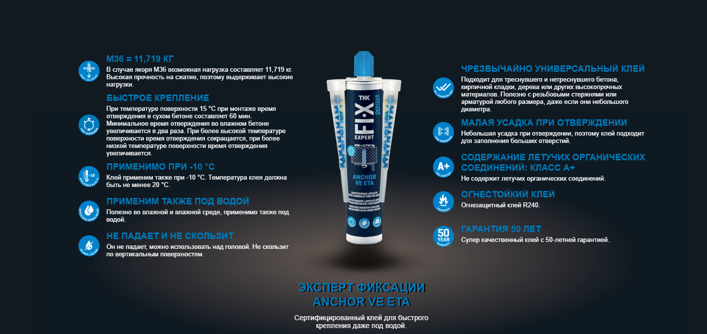 - Rezistență ridicată. - Ușor de extrudat și de injectat. - Creează un sigiliu etanș. - Fără stiren și ușor inodor. - Rezistent la temperaturi cuprinse între -40°C și 80°C. - De asemenea, este potrivit pentru umplerea găurilor și fisurilor. Domeniul de aplicare: - Pentru ancorarea chimică a barelor de armătură puternic și normal încărcate în piatră, beton, beton ușor, cărămizi, lemn. - Pentru încărcături grele și materiale aflate permanent sub apă. - Ca mortar de restaurare sau adeziv pentru elemente din beton. - Ca adeziv pentru elemente de fațadă, structuri din lemn, structuri metalice, consolă, garduri, racorduri sanitare, țevi. - Adezivul nu se umflă în timpul întăririi și, prin urmare, este potrivit pentru sarcini plasate în apropierea marginilor clădirilor. - Potrivite pentru fixarea porților, gardurilor, jaluzelelor, antenelor, consolelor, legăturilor de cablu și echipamentelor industriale. Instructiuni de utilizare: Mortarul și betonul trebuie să aibă o vechime mai mare de 28 de zile. Gaura de sondaj trebuie să fie uscată, fără grăsime, bine periat și sablat cu aer. Instalarea de ancore în materiale dure piatră, beton Gaura de sondaj este forată perpendicular pe suprafață cu un burghiu de impact. Gaura de sondaj se curăță bine cu o perie rotundă cu diametrul mai mare decât gaura de sondaj și se suflă cu aer. Se poate folosi o pompă manuală. Suflați de cel puțin 4 ori de pe fundul puțului. Deșurubați capacul, scoateți folia din cartuș și tăiați-o pentru a se potrivi cu filetele cartușului. Înșurubați bine mixerul static pe cartuș. Asigurați-vă că ambele componente se află în malaxorul static. Așezați cartușul în pistol și începeți extruziunea. Adezivul este bine amestecat dacă are o culoare gri uniformă. Primii 10 cm din masă nu trebuie să fie utilizați pentru fixare. Umpleți gaura de jos în sus. Umpleți aproximativ 2/3 din gaură, dar asigurați-vă că tot spațiul dintre perete și ancoră este umplut până la adâncimea maximă. Asigurați-vă că ancora este uscată și curată. Ancora trebuie introdusă în gaura umplută în timp ce se rotește încet, iar adezivul trebuie să iasă pe partea laterală a găurii. Îndepărtați orice exces de adeziv. Trebuie să aveți grijă să introduceți ancora înainte de expirarea timpului de lipire. Ancora nu trebuie să fie mișcată sau încărcată în timpul perioadei de întărire. Instalați ancorele în cărămida goală. Faceți găurile cu un burghiu adecvat. Curățați bine orificiul de găurire cu o perie rotundă al cărei diametru este mai mare decât diametrul orificiului de găurire și suflați-o cu aer. Introduceți un manșon cu găuri de diametru și lungime corespunzătoare în gaura de găurire. Procedați la fel ca mai sus, doar că umpleți întregul manșon cu adeziv.