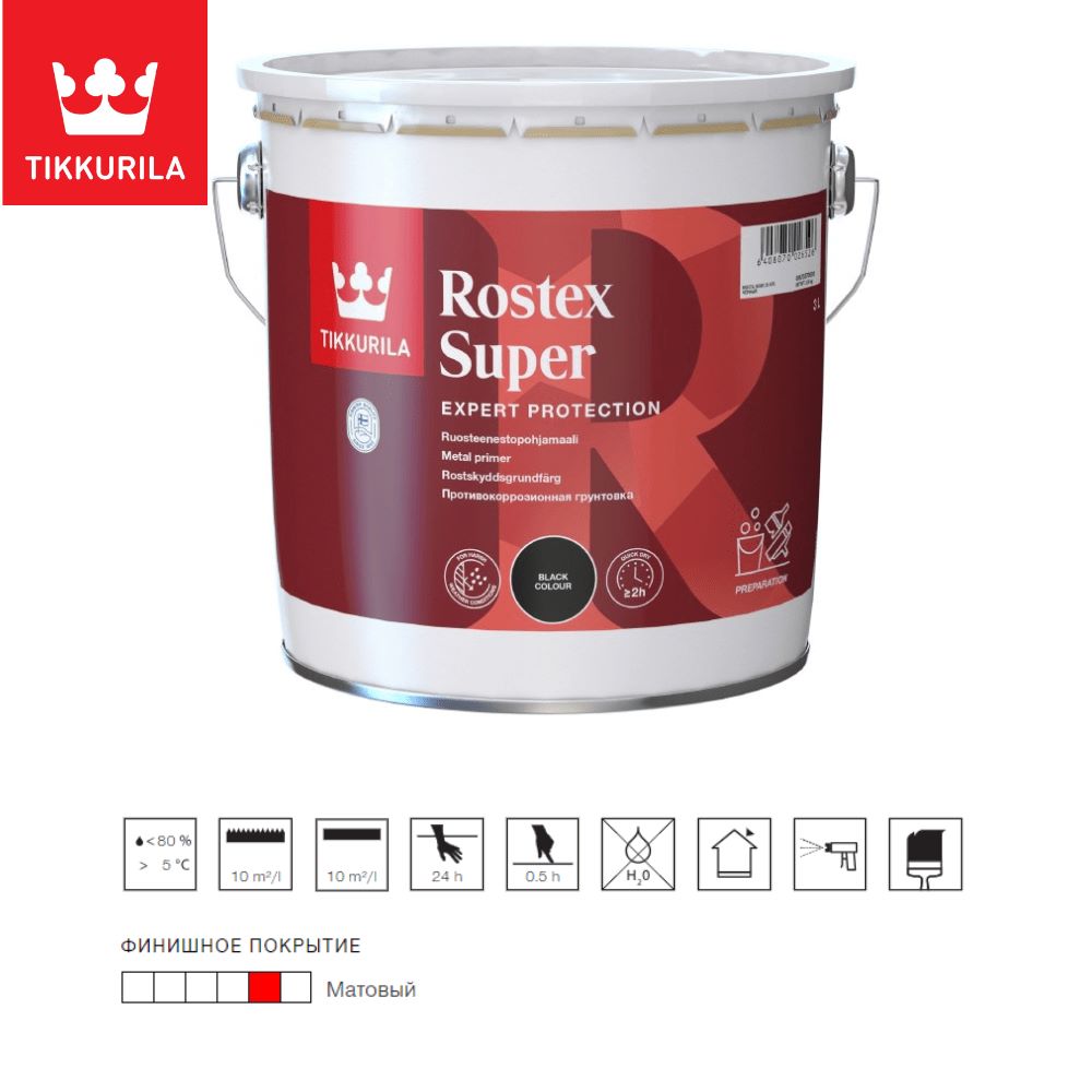 Vopsirea: Suprafețele grunduite cu Tikkurila «Rostex Super» pot fi vopsite cu vopseaua pe bază de apă Tikkurila «Panssari Akva» sau cu vopseaua pe bază de solvent Tikkurila «Panssarimaali».