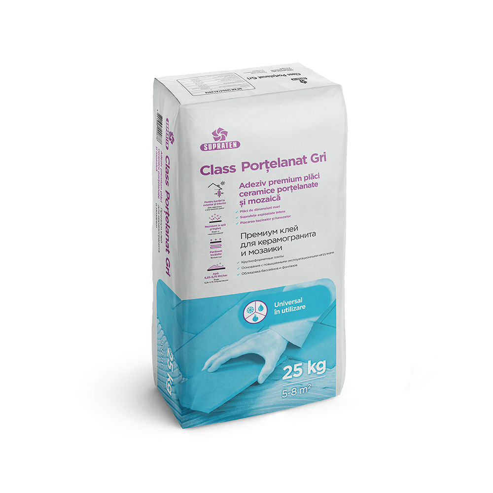 CLASS PORȚELANAT — клей премиум класса на основе смеси специального высококачественного цемента, реологических и армирующих добавок, полимеров и калиброванной кварцевой муки.