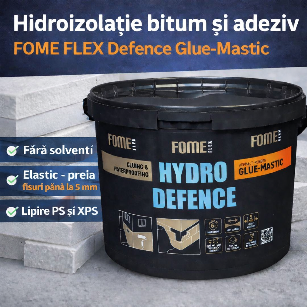 FOME FLEX Defence Glue-Mastic este un compus bituminos multifuncțional pentru hidroizolații ușoare, medii și grele, precum și pentru lipirea plăcilor din polistiren (PS, XPS) pe diverse suporturi.