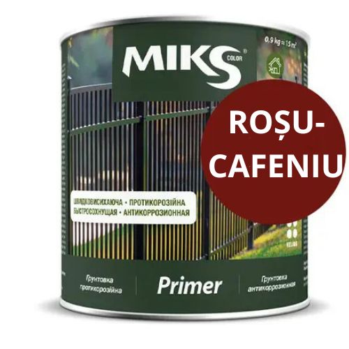 Grund anticoroziune ”MIKS COLOR” - amorsă anticorozivă cu uscare rapidă pentru amorsarea suprafețelor metalice și din lemn înainte de vopsirea cu materiale alchidice, acrilice și alte materiale de bază. Caracteristici: - Protecție eficientă împotriva ruginii; - Consum economic; - Acțiunea sarurilor și a uleiurilor; - Rezistă la schimbări de temperature de la minus 450 la 600 °C; - Uscare rapidă; - Nu conține compuși de metale grele deosebit de periculoase.